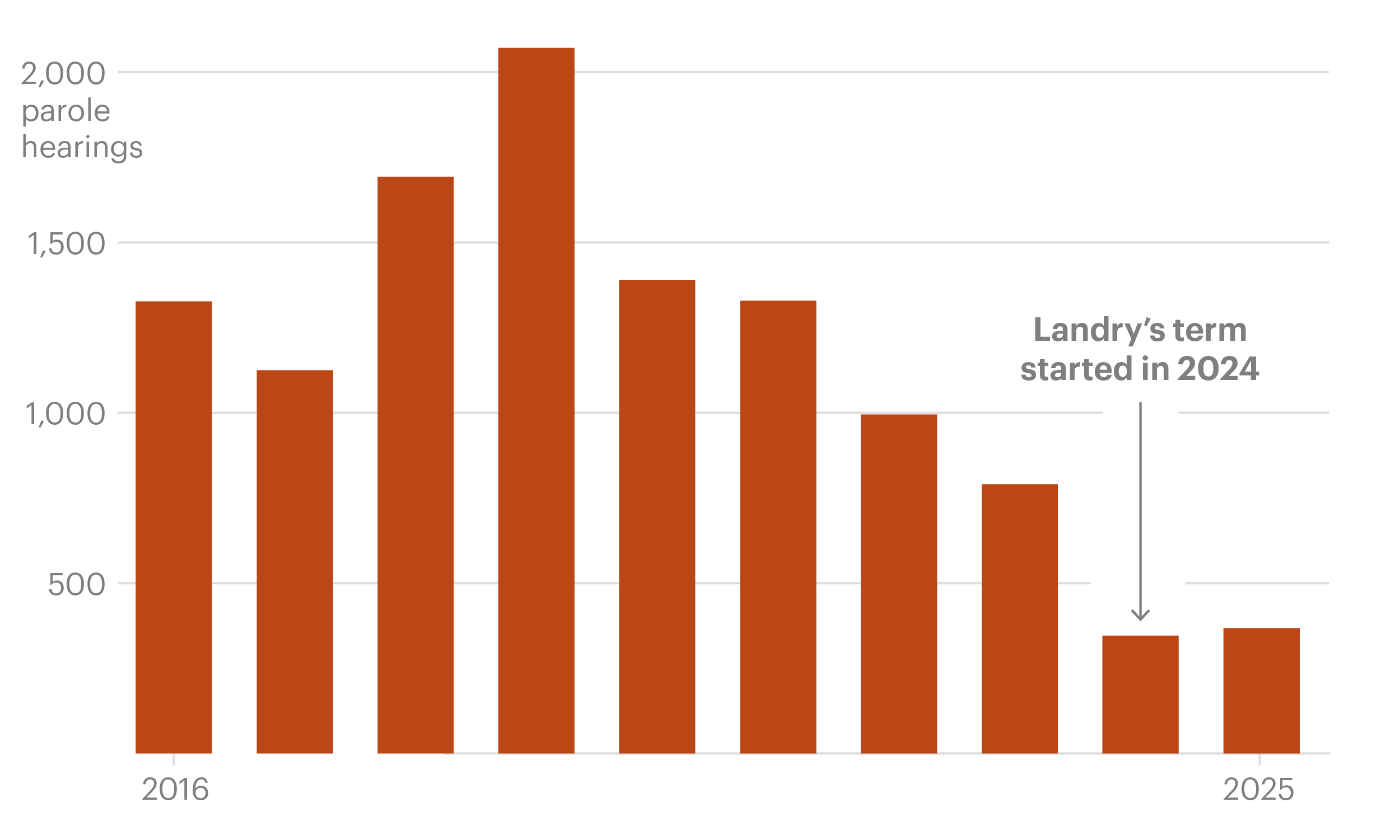 The parole board freed 185 prisoners during Landry’s tenure compared with 858 in the two years before his January 2024 inauguration, a 78% drop, according to a Verite News and ProPublica analysis of data provided by the Louisiana Board of Pardons and Committee on Parole.
