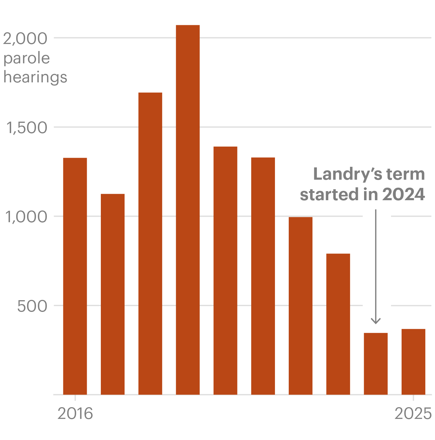 The cumulative impact of these changes has caused the number of parole applications to dramatically fall. In the two years prior to Landry’s inauguration, the board held 1,785 hearings. That number dropped to 714 in Landry’s two years as governor.