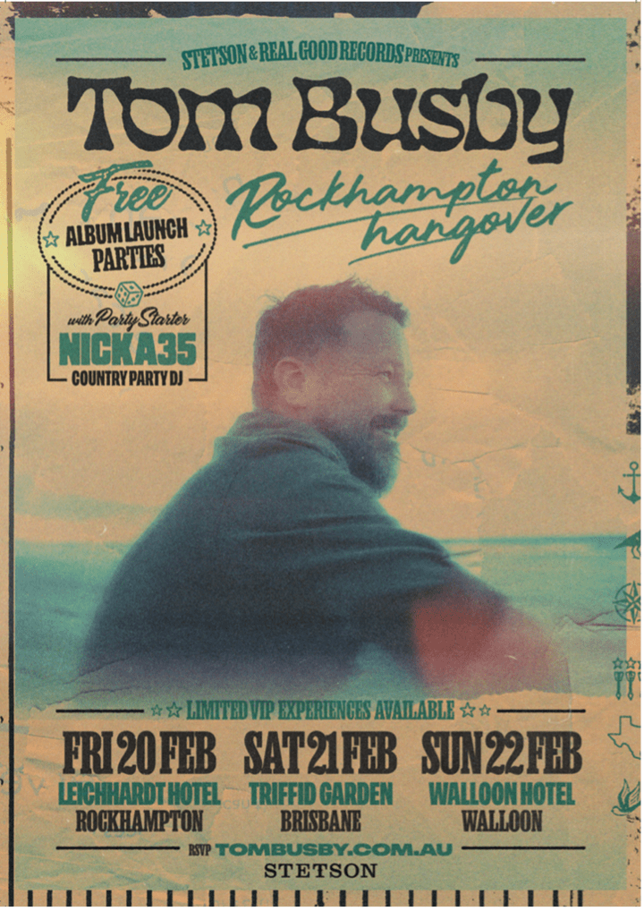 Tom Busby a confirmé trois concerts de lancement d'album dans le Queensland pour marquer la sortie de son premier album solo Chat de Rockhamptonattendu le vendredi 20 février. Les spectacles mettront en vedette Busby avec son groupe complet et sont gratuits sur inscription via son site Web.