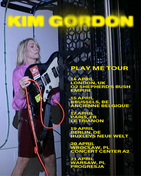 Avec son troisième album solo JOUE-MOI sortira le 13 mars via Matador, Kim Gordon a prévu une série de dates de gros titres et de festivals à travers le Royaume-Uni et l'Europe ce printemps, combinant du nouveau matériel avec l'intensité discrète qui a caractérisé son travail solo. Les dates font suite à l’annonce du premier single « NOT TODAY », un morceau éthéré et rythmé qui signale un subtil changement d’orientation plutôt qu’un virage brusque.