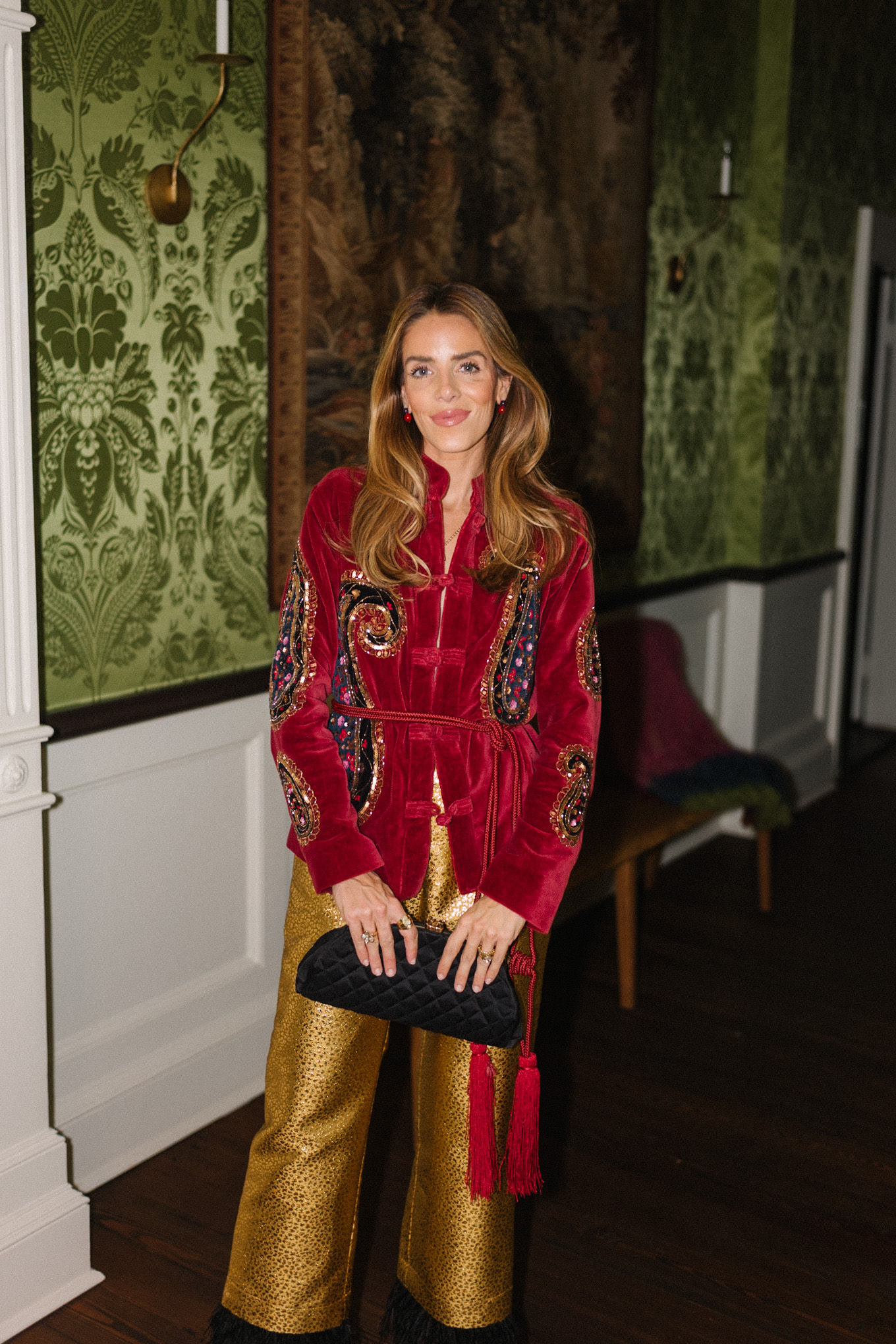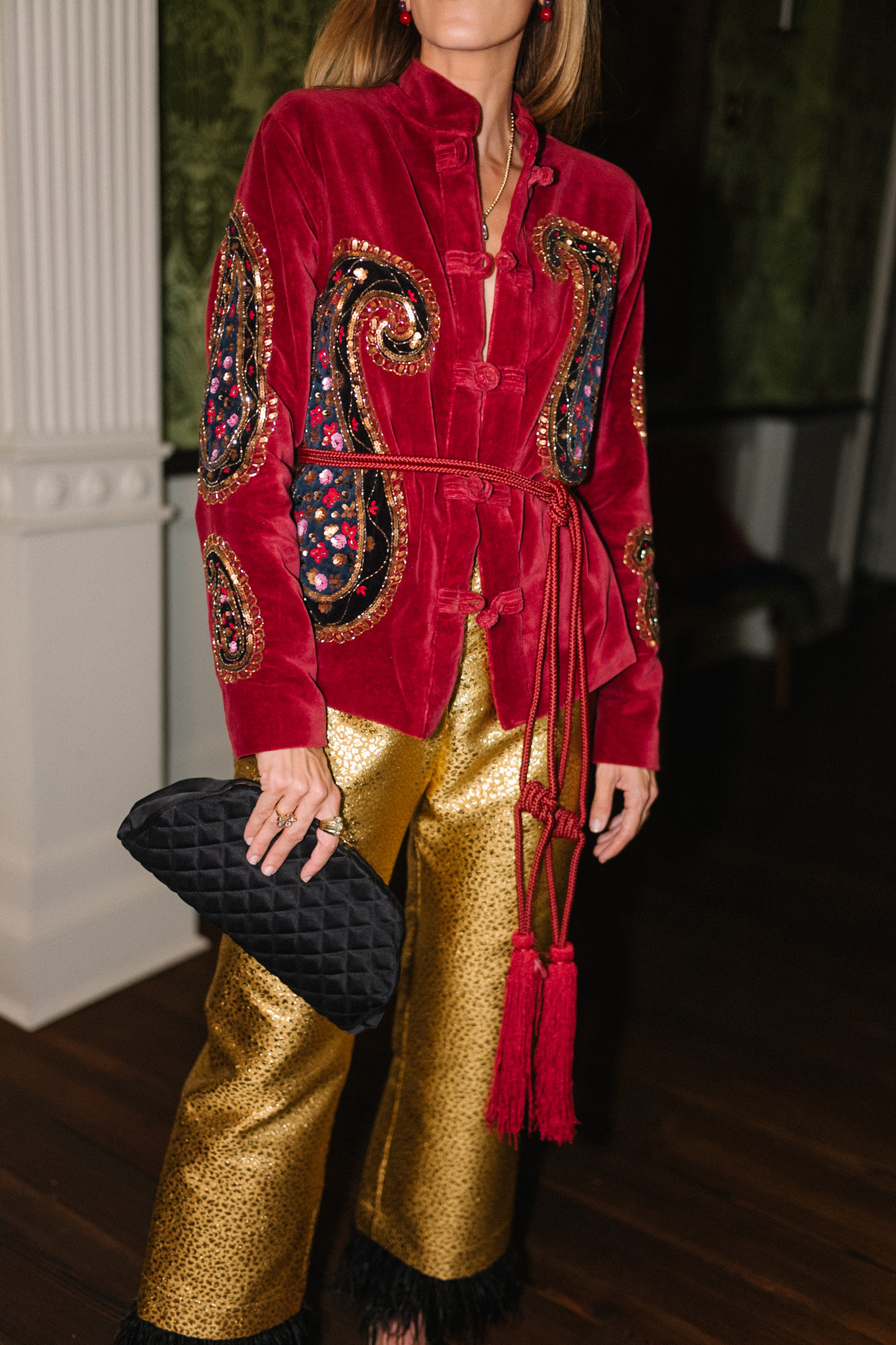 Veste Philippa 1970 (similaire ici), pantalon Eleanor Leftwich (épuisé, similaire ici), escarpins Jimmy Choo, pochette Chanel (similaire ici et ici)