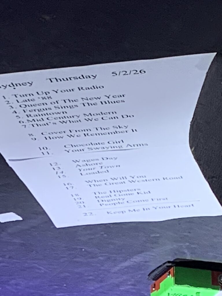 Ce sentiment de reconnaissance arrive tôt, lorsque « Fergus Sings the Blues » apparaît dans la section d'ouverture, plongeant l'Enmore dans un silence attentif tandis que Ross raconte son histoire avec une précision tranquille. Au fur et à mesure que l'ensemble se déroule, “Real Gone Kid” donne plus tard un élan. Lorsque « Dignity » apparaît au plus profond du spectacle, la réaction est viscérale et le refrain devient un souvenir partagé.