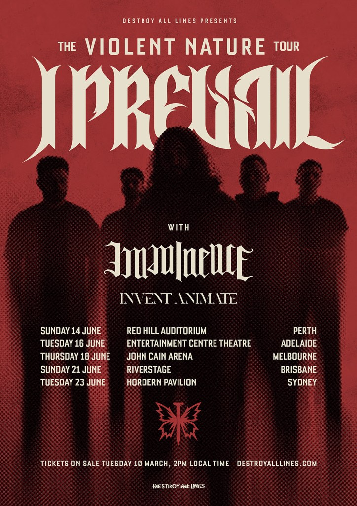 I Prevail a annoncé son retour en Australie et a confirmé une tournée nationale dans les arènes en juin pour soutenir leur dernier album. Caractère violent. Le groupe du Michigan se produira à Perth, Adélaïde, Melbourne, Brisbane et Sydney, marquant ainsi leur plus grand concert en tête d'affiche en Australie à ce jour.