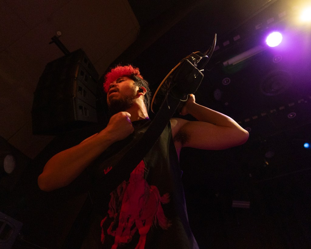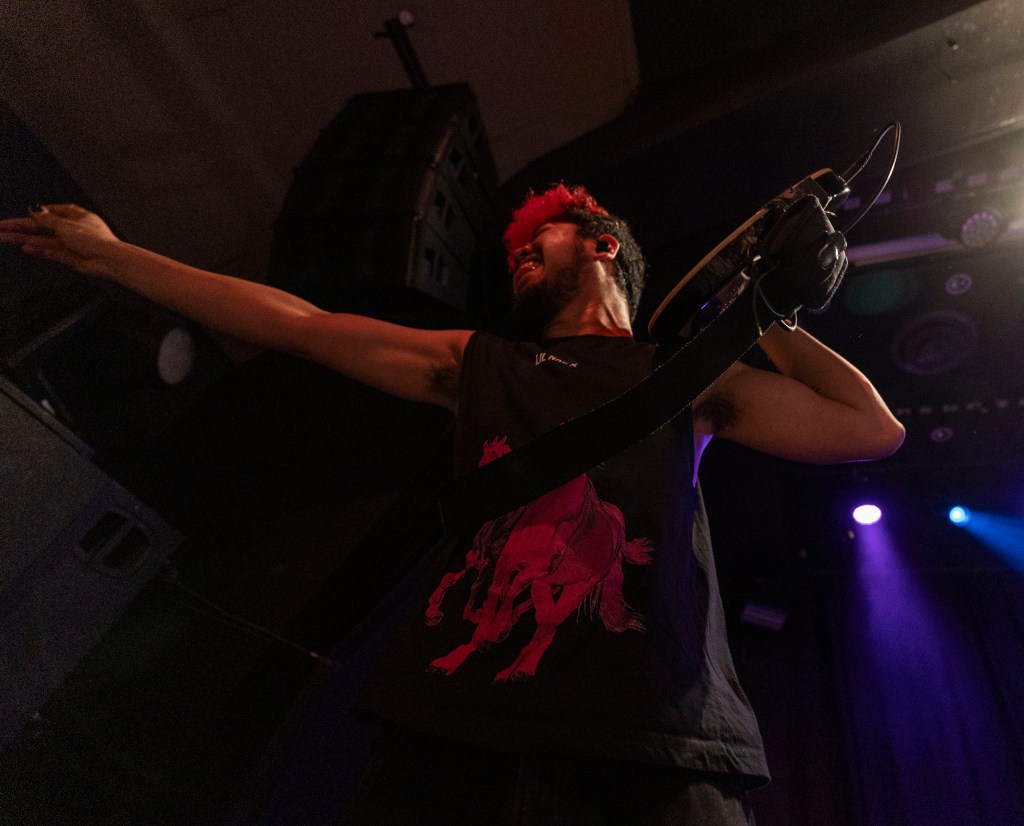 La soirée commence avec un chanteur australienBleu azurRéchauffer la foule avec un set construit sur une voix ample et des instincts alt-pop sophistiqués. Les premiers arrivés se rapprochent de la scène alors que la voix d'Azure remplit la pièce, donnant un ton à la fois intime et tranquille. C'est le calme avant que les pédales de distorsion n'interviennent.
