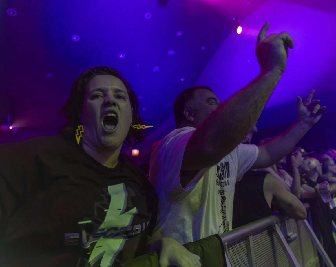 La foule explose derrière moi. Je suis coincé dans une fosse photographique qui semble avoir été conçue pour une espèce différente, plus étroite qu'une mauvaise décision, le genre d'espace qui recommande agressivement que je lance Ozempic comme un entraîneur personnel insistant tandis que la pièce bouge comme un organisme unique. Ce n'est pas de la nostalgie, pas vraiment. C'est quelque chose de plus sauvage. Ces chansons, « Danger ! » « High Voltage », « Gay Bar », « Dance Commander », ne vieillissent même pas, mais mutent et prennent une nouvelle étrangeté à chaque fois qu’elles sont jouées.