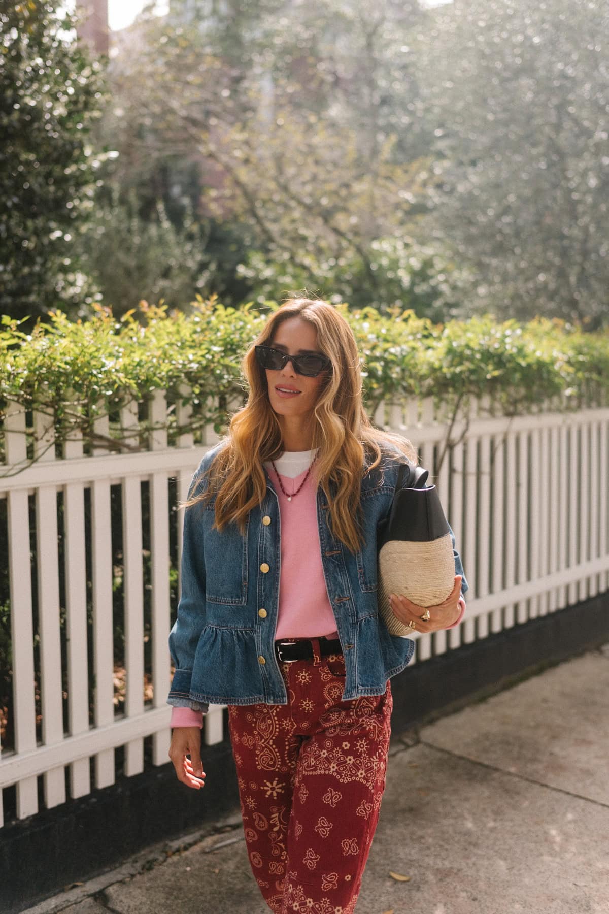 Veste Ulla Johnson, pull, t-shirt et jean Amazon, ceinture Nour Hammour (similaire ici et ici), chaussures plates Chanel (sur The RealReal, similaires ici), sac Altuzarra, lunettes de soleil Dior