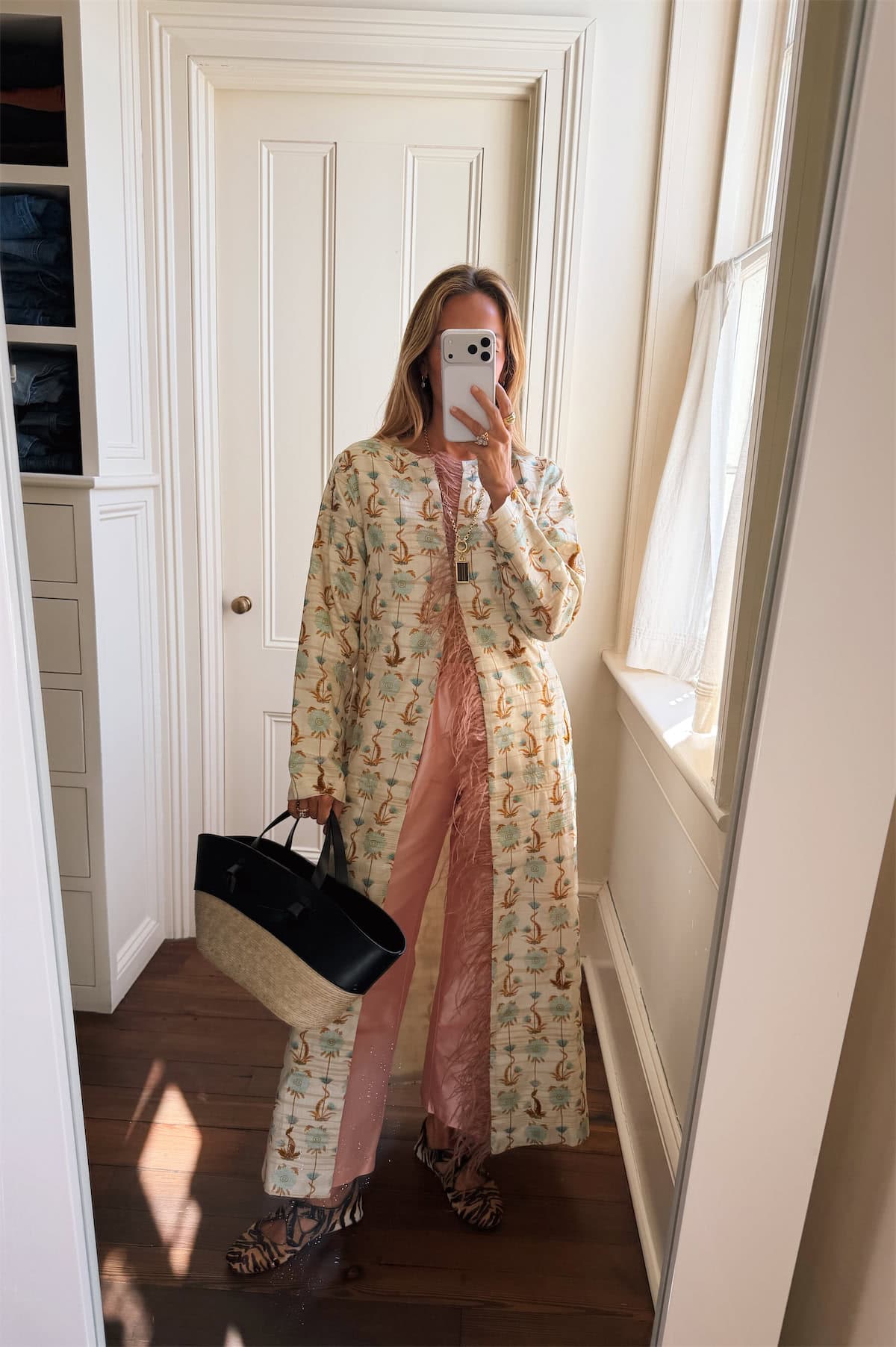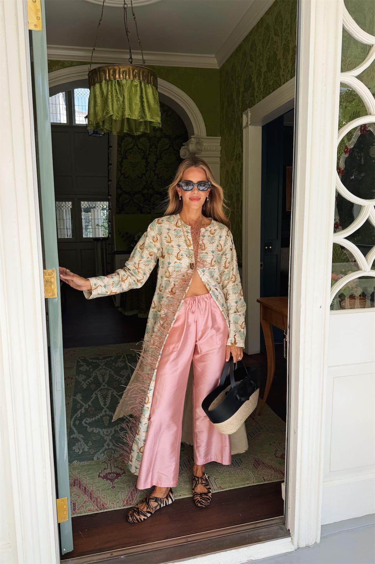 Veste Chan Luu, pantalon Donni, chaussures plates Alaia, sac Altuzarra, lunettes de soleil Dior, collier Sherman Field (épuisé, similaire ici)
