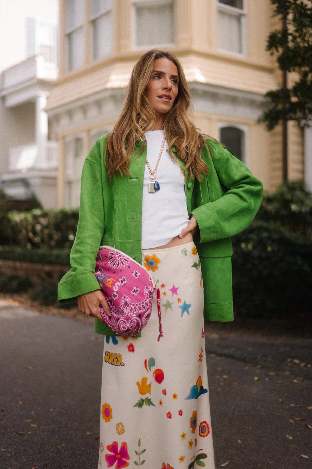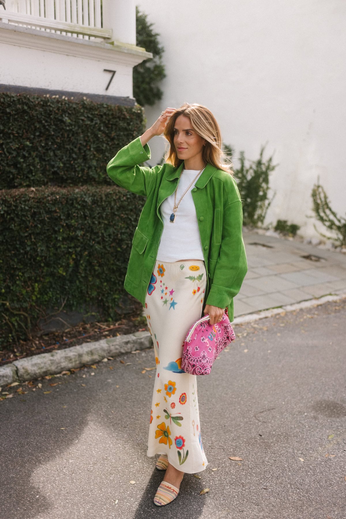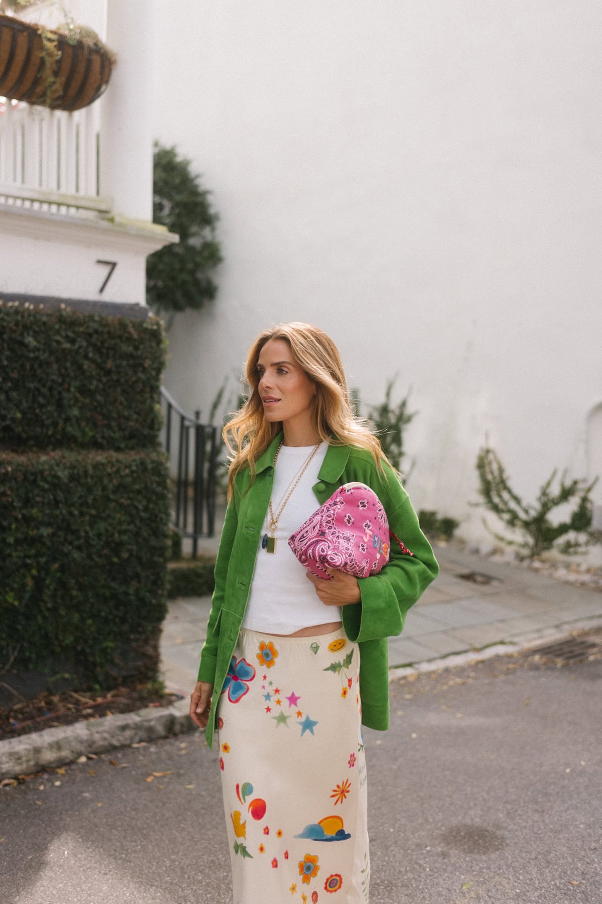 Veste Staud (plus de tailles ici), chemise Flore Flore, jupe Mother, chaussures compensées Valentino (en soldes), sac Call It By Your Name, colliers Sherman Field et Zoe Chicco
