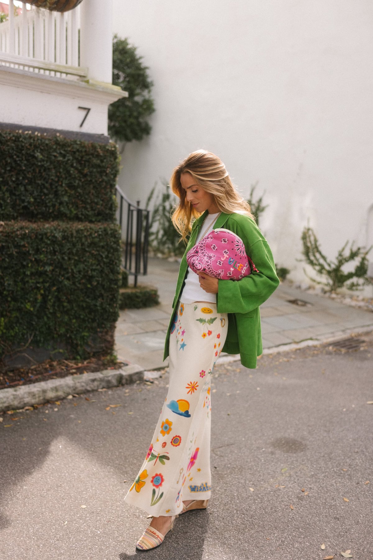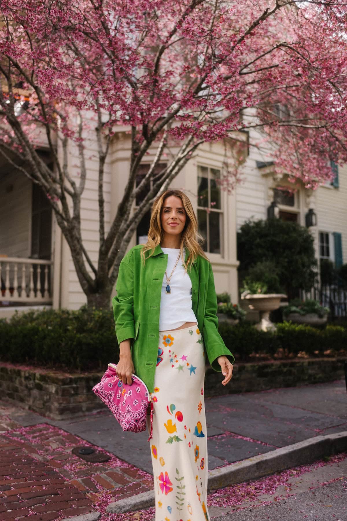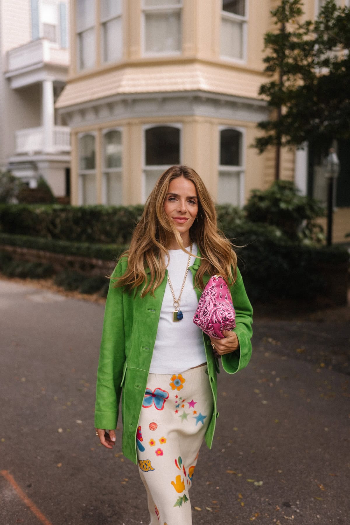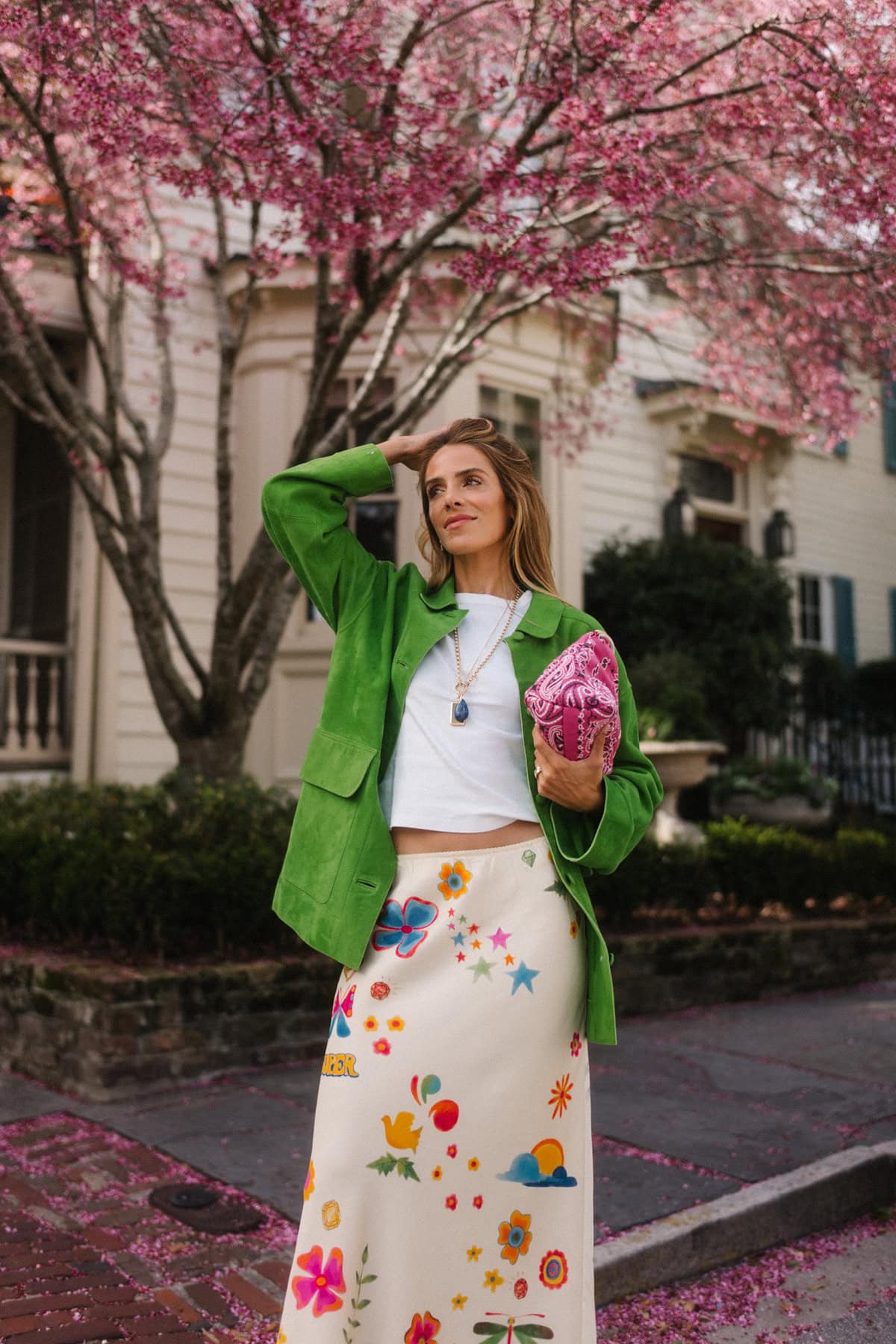 Veste Staud (plus de tailles ici), chemise Flore Flore, jupe Mother, chaussures compensées Valentino (en soldes), sac Call It By Your Name, colliers Sherman Field et Zoe Chicco