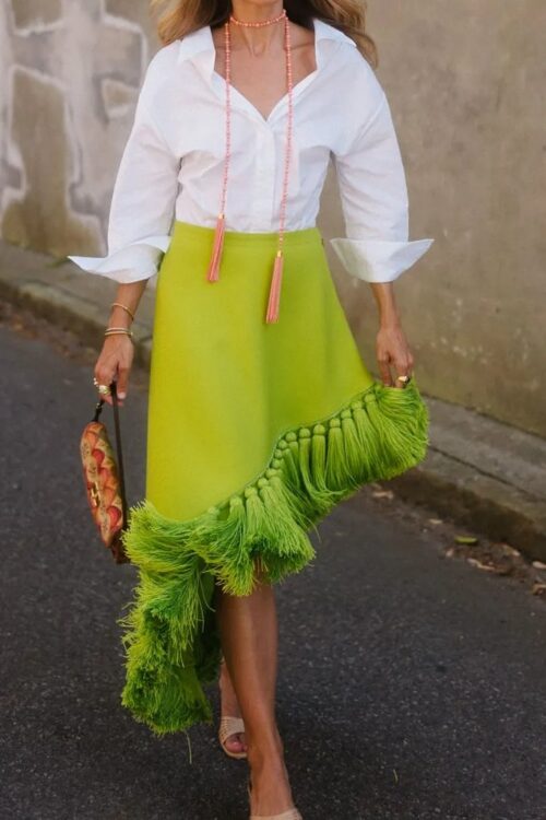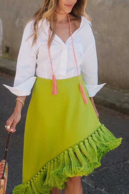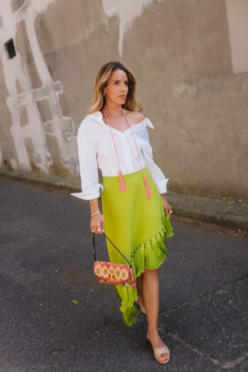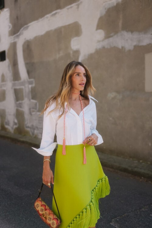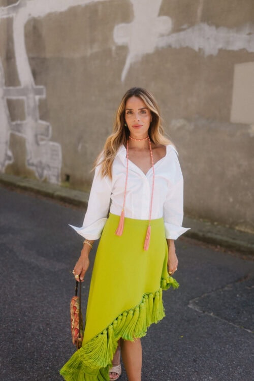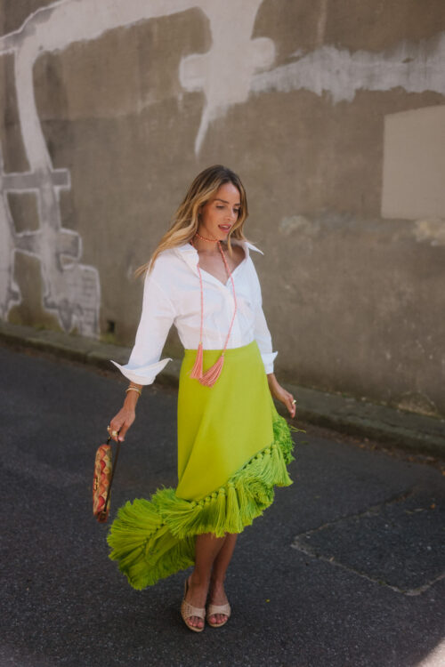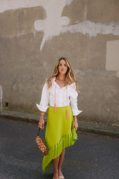 Je vois des détails de pompons partout en ce moment et je suis totalement dedans. La façon dont il bouge ajoute un peu plus de dynamisme même aux pièces les plus classiques. Une jupe simple avec un ourlet à pampilles, un haut structuré avec une finition douce ou un sac tissé avec un subtil décolleté en forme de goutte ajoutent ce petit quelque chose en plus.