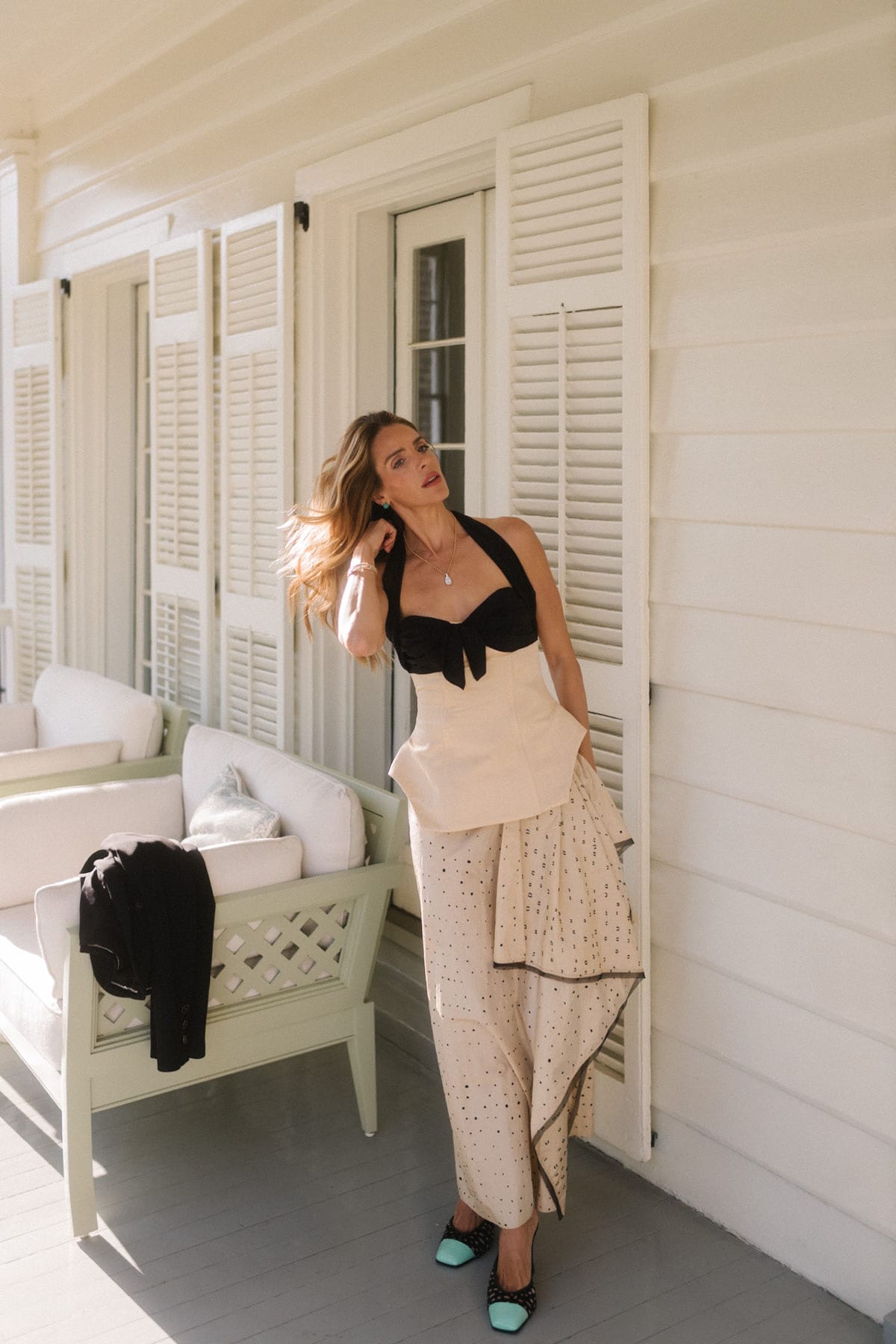 Il y a généralement une base, une jupe ou une robe fluide qui bouge avec le corps plutôt que de le maintenir en place. La soie transparente et légère coupée en biais empêche le look de paraître trop rigide ou rigide. L'ajout d'une veste ajustée, d'un corset profilé ou d'un haut épuré et architectural déplace toute l'énergie, définit la forme et crée un contraste avec ce mouvement sans le compromettre.