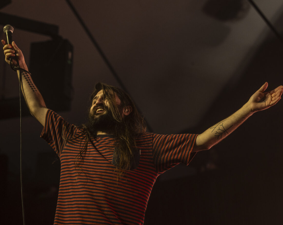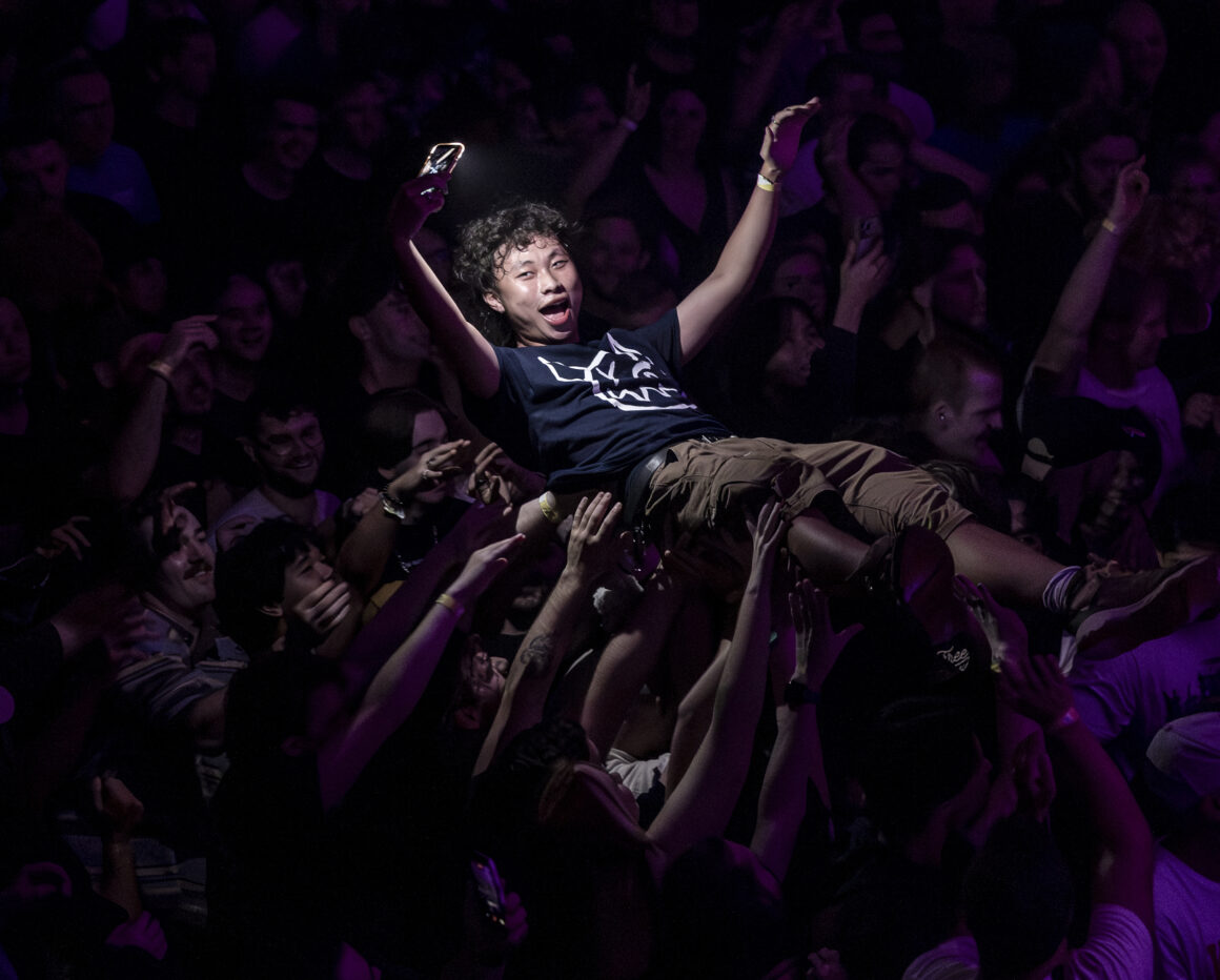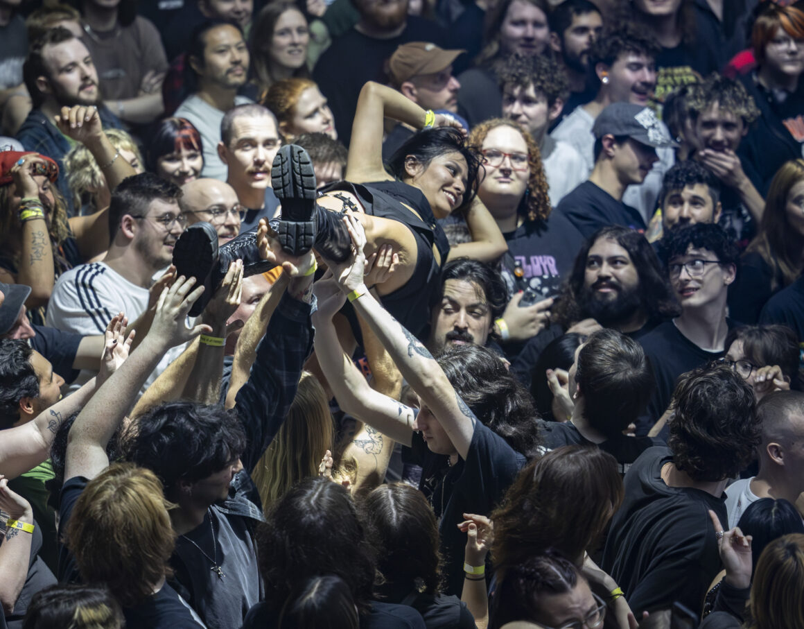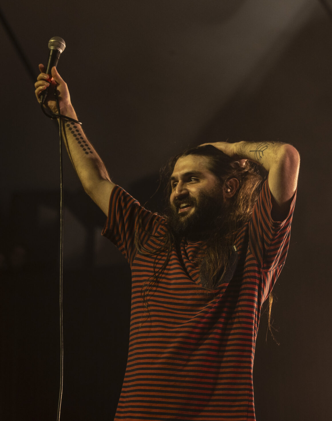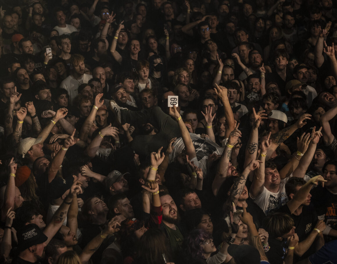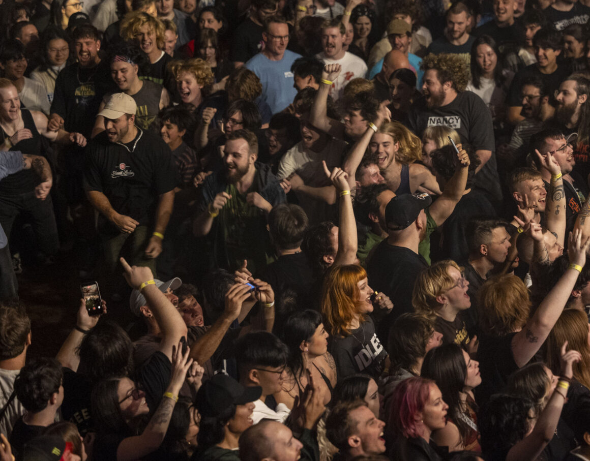 Au fur et à mesure que le décor prend de la vitesse, la foule devient un acte à part entière. Les crowdsurfers roulent sans fin vers la barrière, vague après vague, tandis que des fosses circulaires éclatent sur le sol, s'effondrent et se reforment ailleurs quelques instants plus tard. La salle bouge avec le groupe plutôt que de simplement les regarder. Set d'ouverture Comment tu ne sais pas ? Coquilles de tatou Dès le début, les premiers corps s'élèvent dans le ciel. Boire du lait et courir Et Pssst ! Le golf est populaire Gardez la pièce en mouvement constant Mouvement de mouche (tout le temps) transformant le sol en un tas géant de membres et de joie.