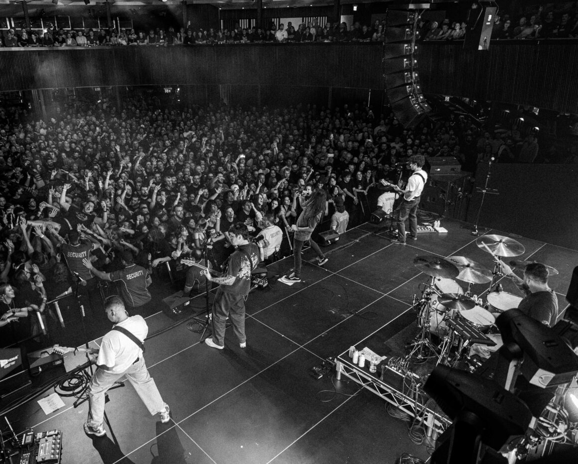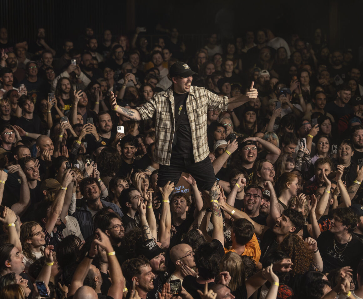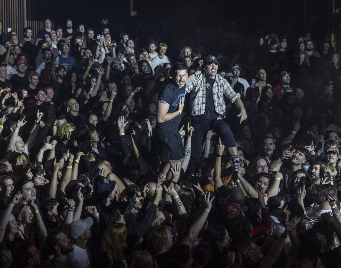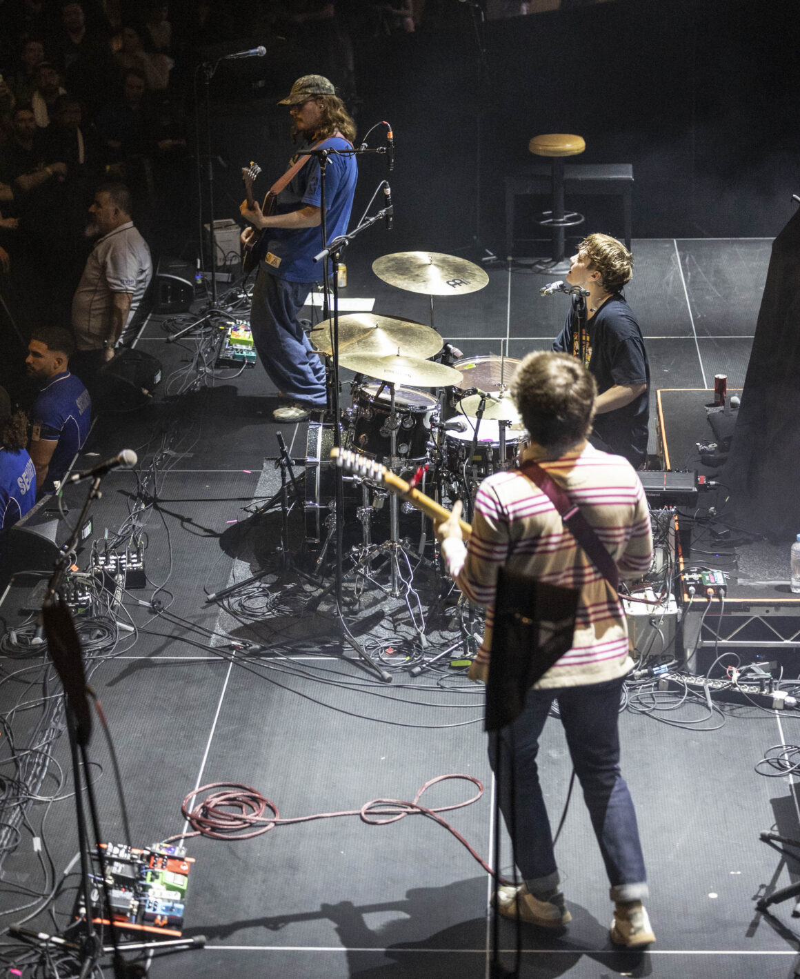 Le soutien arrive chez vous samedi, le trio de Kalamazoo, Michigan fait ses débuts australiens et entre dans la salle sans hésitation. Formé en 2021 par des amis de la Western Michigan University, le chanteur et bassiste Esden Stafne, le chanteur et batteur Gabe Wood et le guitariste Mitch Gulish se sont illustrés à travers des sorties telles que « quelque chose qui mérite d'être célébré, toujours nuageux et 2025 ces choses arrivent. Leur set se situe quelque part entre l’intimité d’un spectacle en sous-sol et la catharsis d’une salle pleine, pleine de mélodies déchirantes et d’un élan dur. Loin de les considérer comme un acte d'échauffement, Sydney réagit de manière extravagante, criant des refrains et jetant des corps dans le ciel dès le début. Lorsque l’inévitable demande de chaussures arrive, le trio se soumet à l’étrange rite australien avec une stupéfaction admirable et l’acceptation immédiate de la pièce.