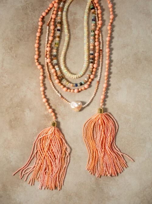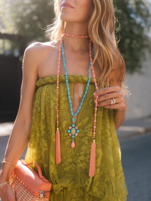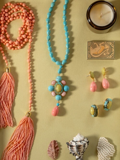 Le turquoise était une constante dans les quatre collections, et cette fois j'ai voulu l'associer au corail, l'une de mes combinaisons préférées par temps chaud. Cela apparaît sur les colliers tendance, les brins superposés plus longs et les styles de pompons que je continue de rechercher. Les pompons ressemblent à un créateur de tenues instantané conçu pour être porté au quotidien et en soirée et peut être stylé de différentes manières.