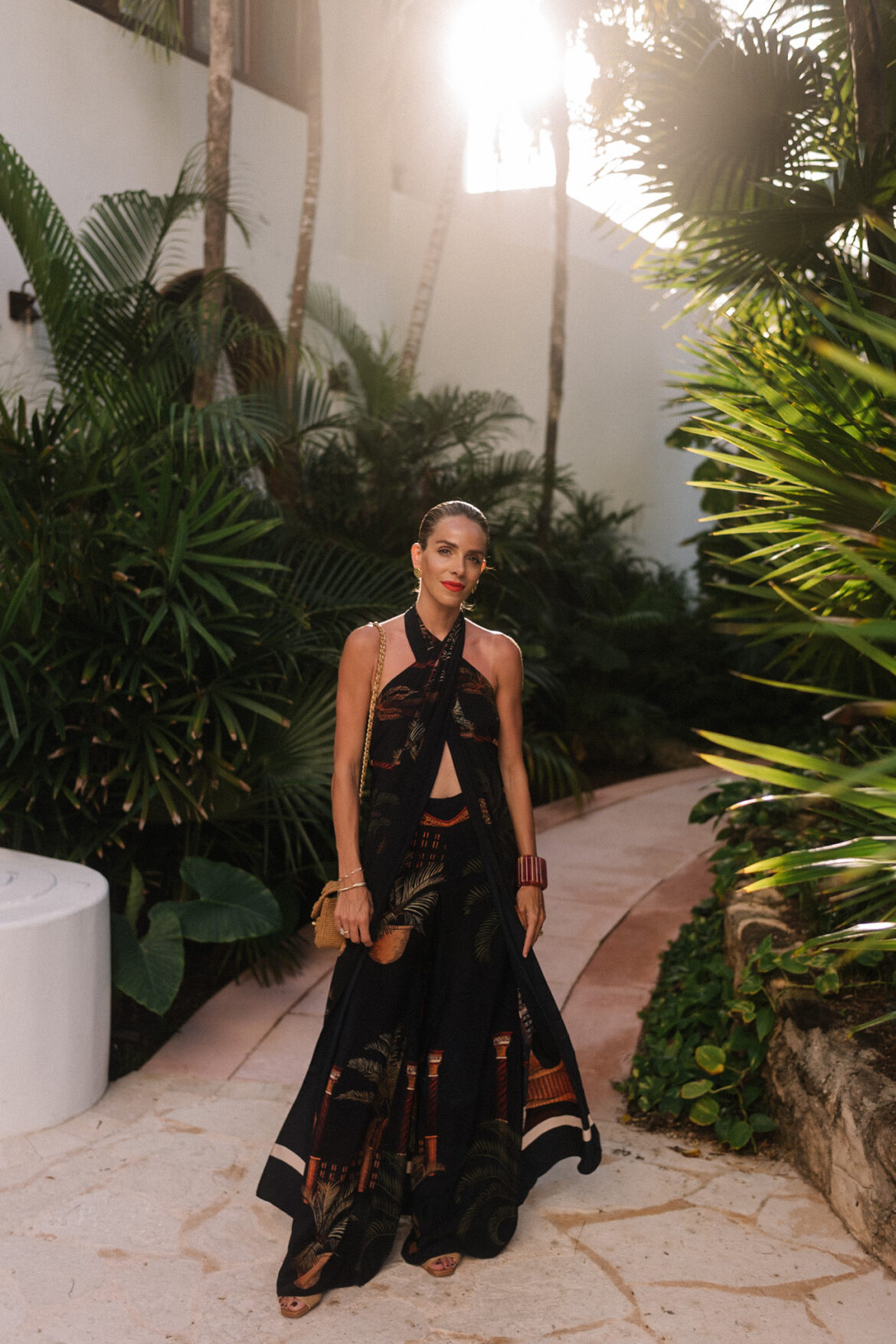Johanna Ortiz Top & Pants (plus de tailles ici et ici), Aquazzura Sales (ancien, similaire ici et ici), bracelet vintage (similaire à ici), Chanel Bag (similaire à ici), Gucci Lipstick dans “Lizzie Tiger”