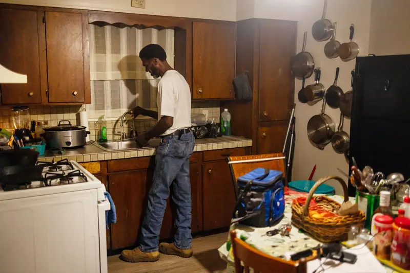 Allen at home. Since his parole almost four years ago, he’s stayed sober and has held a steady job.