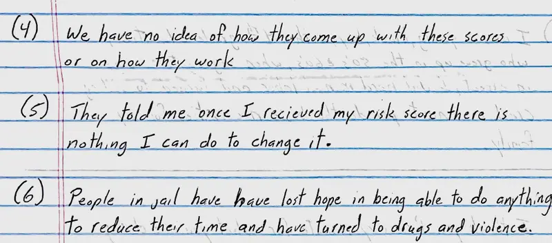 We have no idea of how they come up with these scores or on how they work. They told me once I received my risk score there is nothing I can do to change it. People in jail have have lost hope in being able to do anything to reduce their time and have turned to drugs and violence.