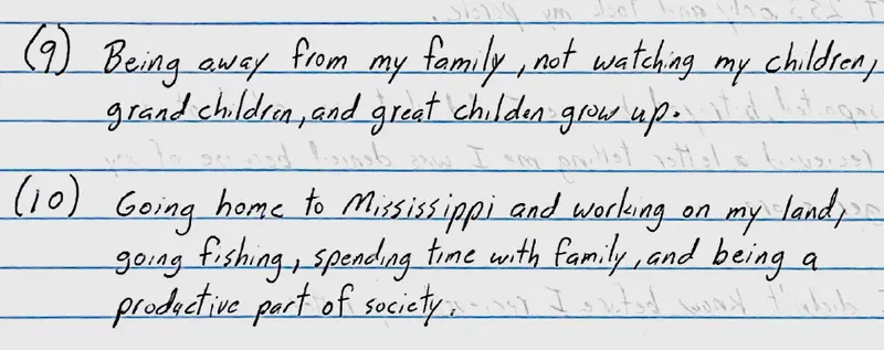 A fellow inmate wrote down Alexander’s answers to Verite and ProPublica’s questions on what he misses and what he would have done had he been granted parole.
