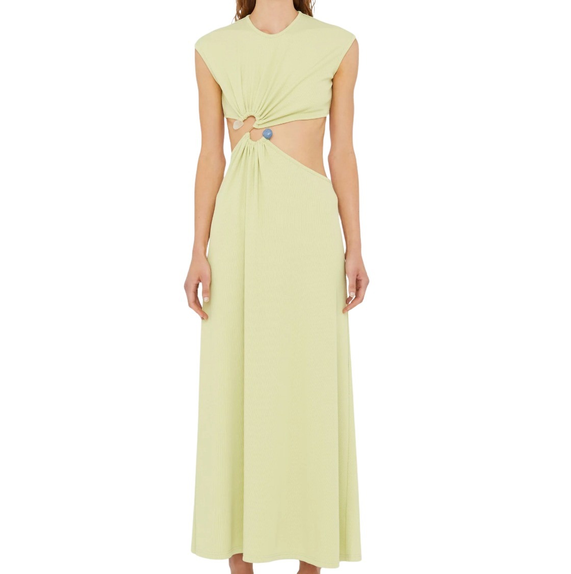 La robe mince et frappante avec un réservoir d'un corps avec un détail de boucle architecturale est la pièce ultime de la déclaration pour les nuits tropicales.