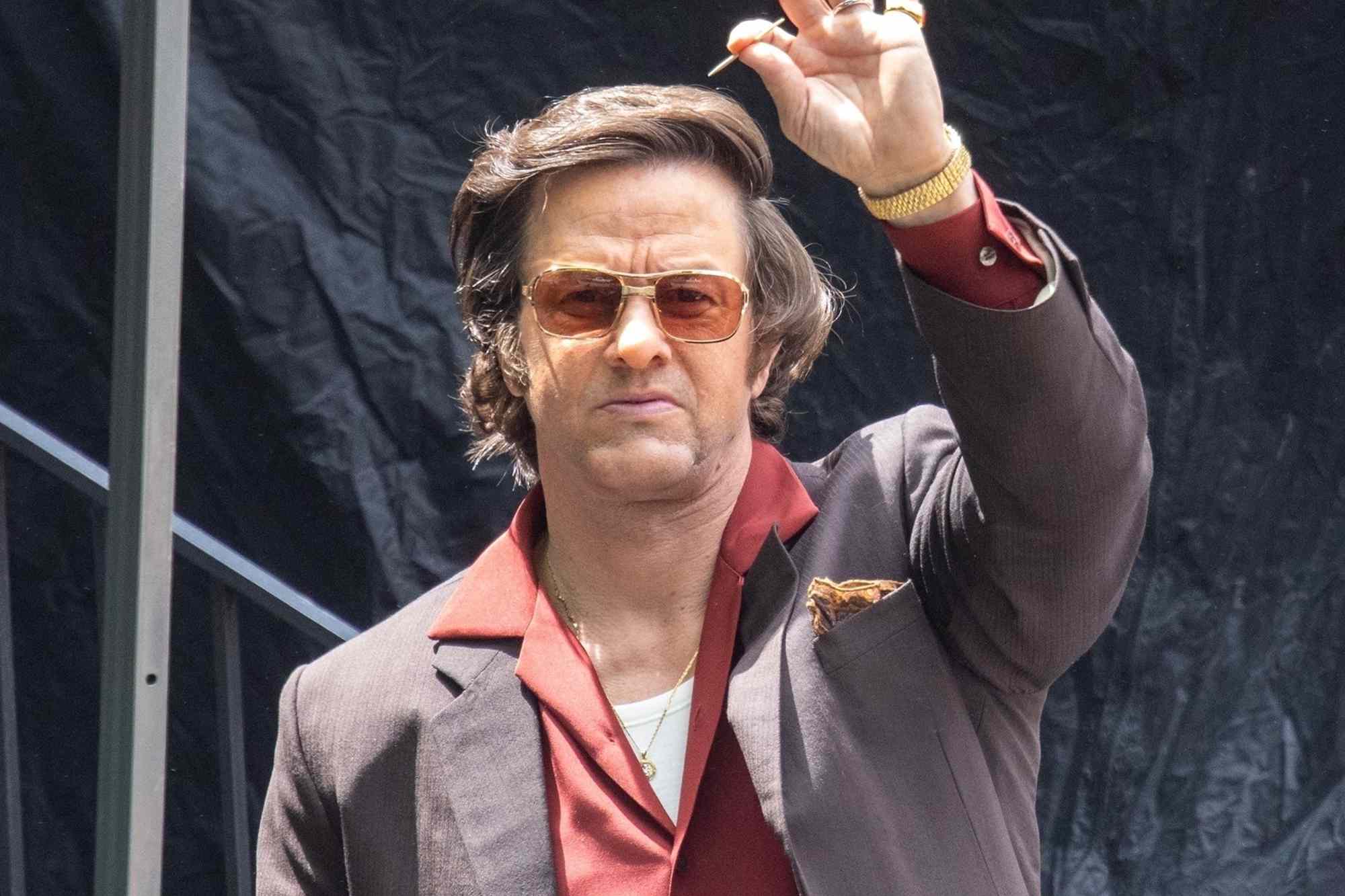 Wahlberg a été représenté dans un costume gris sur une chemise rouge violente, riche avec col. Remplissez le Arsonic En plus de son nez changé, l'authenticité des années 1960 était quelques lunettes de soleil pilotes de couleur ambre et les cheveux longs.