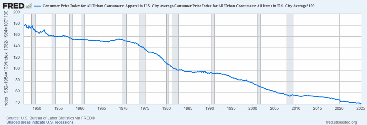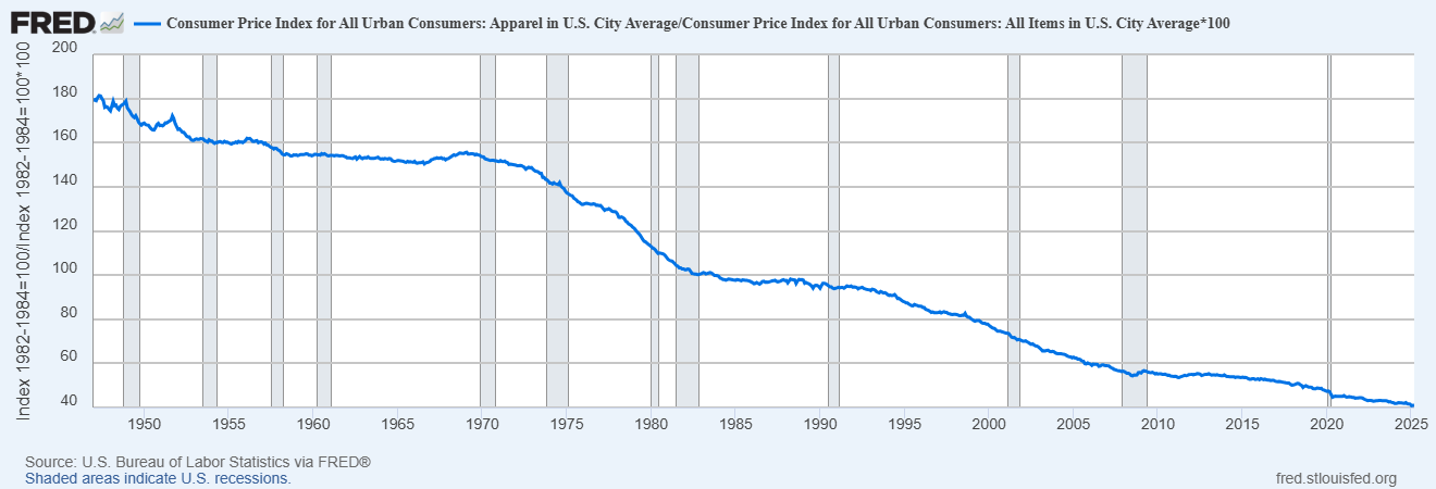 Le bureau des États-Unis (USTR) a récemment tweeté qu'ils voulaient ramener la production de vêtements aux États-Unis. Pourquoi quelqu'un devrait-il vouloir plus d'emplois avec de longues heures et un faible salaire, que ce soit historiquement aux États-Unis ou actuellement au Bangladesh? Dans certains cas, grâce au commerce international, le prix réel des vêtements a diminué de façon spectaculaire (voir illustration ci-dessous). Les dépenses de vêtements sont passées de 9 à 10% des budgets des ménages dans les années 1960 (de 14% en 1900) à environ 3%.