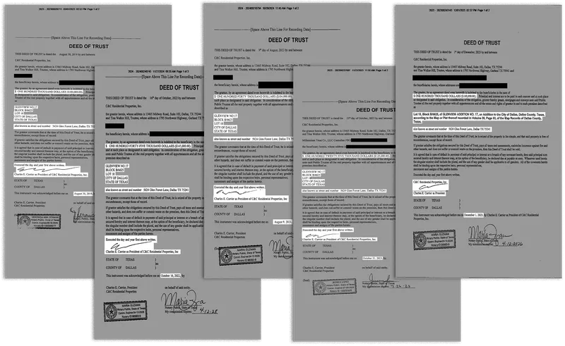 As early as 2020, Carrier had begun taking out multiple loans on individual properties — some of which he never owned. In cases reviewed by ProPublica, as many as five notes were recorded against a single property, far exceeding the property’s value. Carrier also failed to properly record many deeds that were supposed to secure the loans, accumulating more debt than he could ever repay while investors remained unaware they had no collateral for their investments.