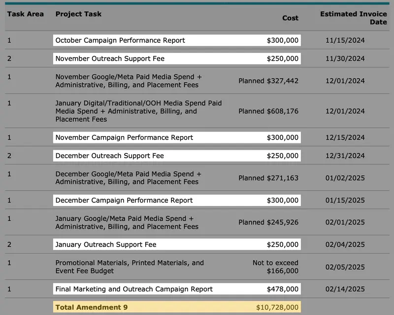 Ein Großteil des Restes des siebenmonatigen Vertrags würde auf zwei Anstrengungen ausgehen: 250.000 US-Dollar pro Monat für Teams mit Deloitte-ausgebildeten Teams, um Broschüren und Waren mit der Marken von Pathways bei Community-Veranstaltungen und 300.000 US-Dollar pro Monat für Deloitte auszugeben, um Berichte über seine eigene Leistung zu erstellen.