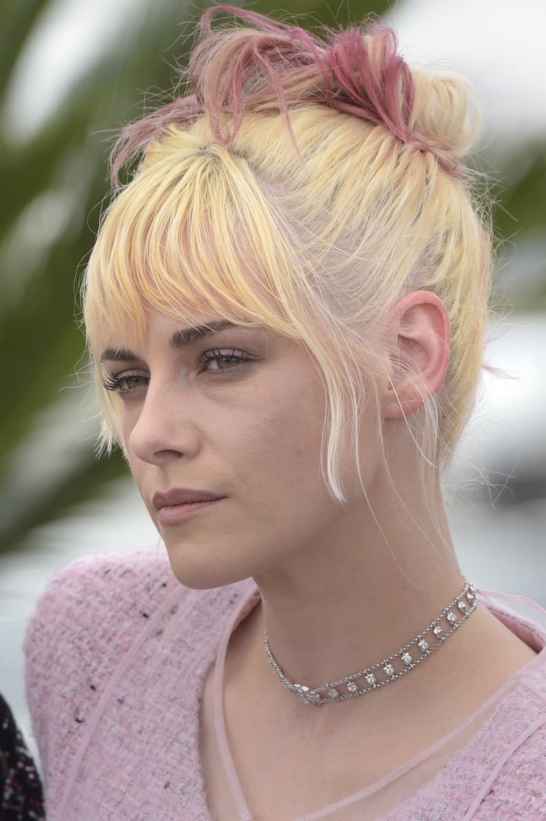 But it seems we’re ready to relive the glory of the aughts all over again with Stewart leading the way. Her new look features a platinum-blond base with choppy, textured layers. The bottom few inches of her hair were dip-dyed a rosy-pink color to add some bold contrast with the blond. Of course, since we’re older and wiser than we were during our Tumblr days, we recommend going to a professional for a color change; Stewart’s hair was done by celebrity stylist Bridget Brager, who has worked with the star for years.