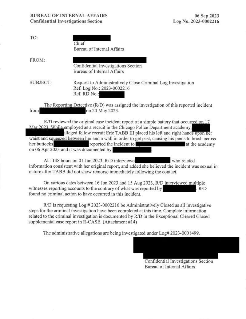 It wasn’t long after Byrd-Maxey tried to alert the academy about Tabb that a second incident occurred. At the end of August 2023, Tabb attended a birthday celebration at a Wrigleyville bar with other recruits. He joined a female recruit on the dance floor and, according to investigative reports and court records, touched her breast, buttock and crotch over her clothes and also grabbed her face and tried to kiss her. He was so aggressive, a witness told investigators, that a mutual friend had to intervene to get him away from the recruit.