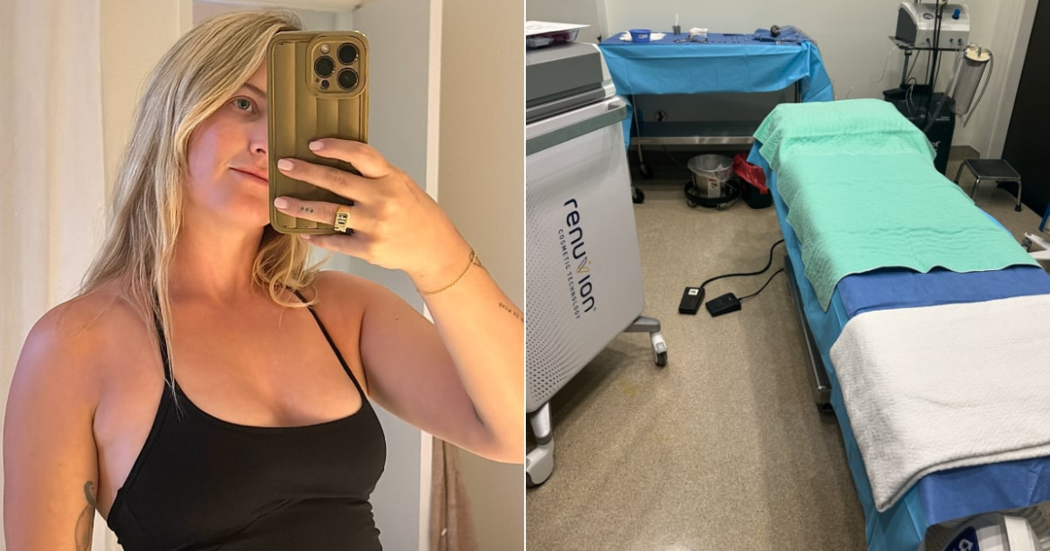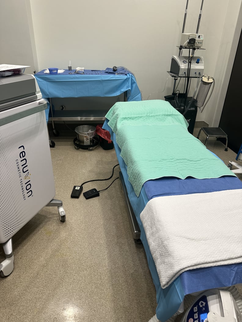 Step 3: Once the fat is removed, it gets washed and prepared to reenter the body. While that’s taking place, the surgeon uses the Renuvion wand under the skin to deliver a combination of radiofrequency energy and helium plasma to the collagen-rich tissue. It contracts the collagen fibers and pulls the skin down closer to the muscle to tighten the area after lipo. I remember feeling some hot bands under my skin, which wasn’t very comfortable, but it wasn’t anything a little more nitrous couldn’t fix.